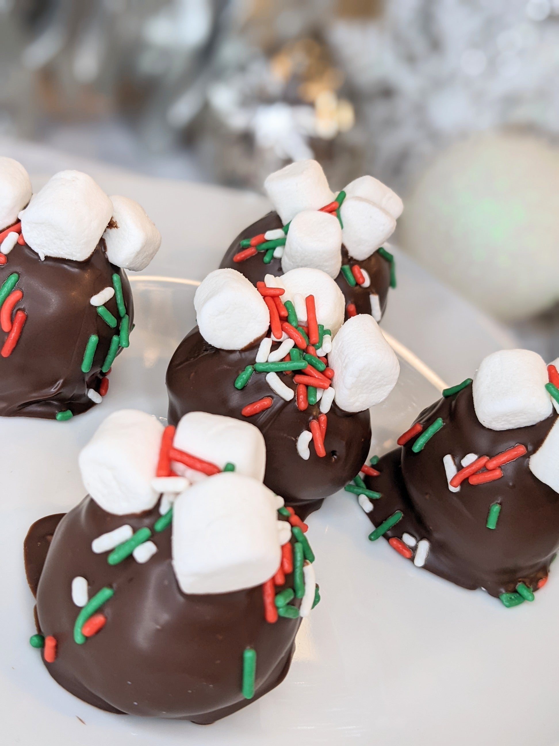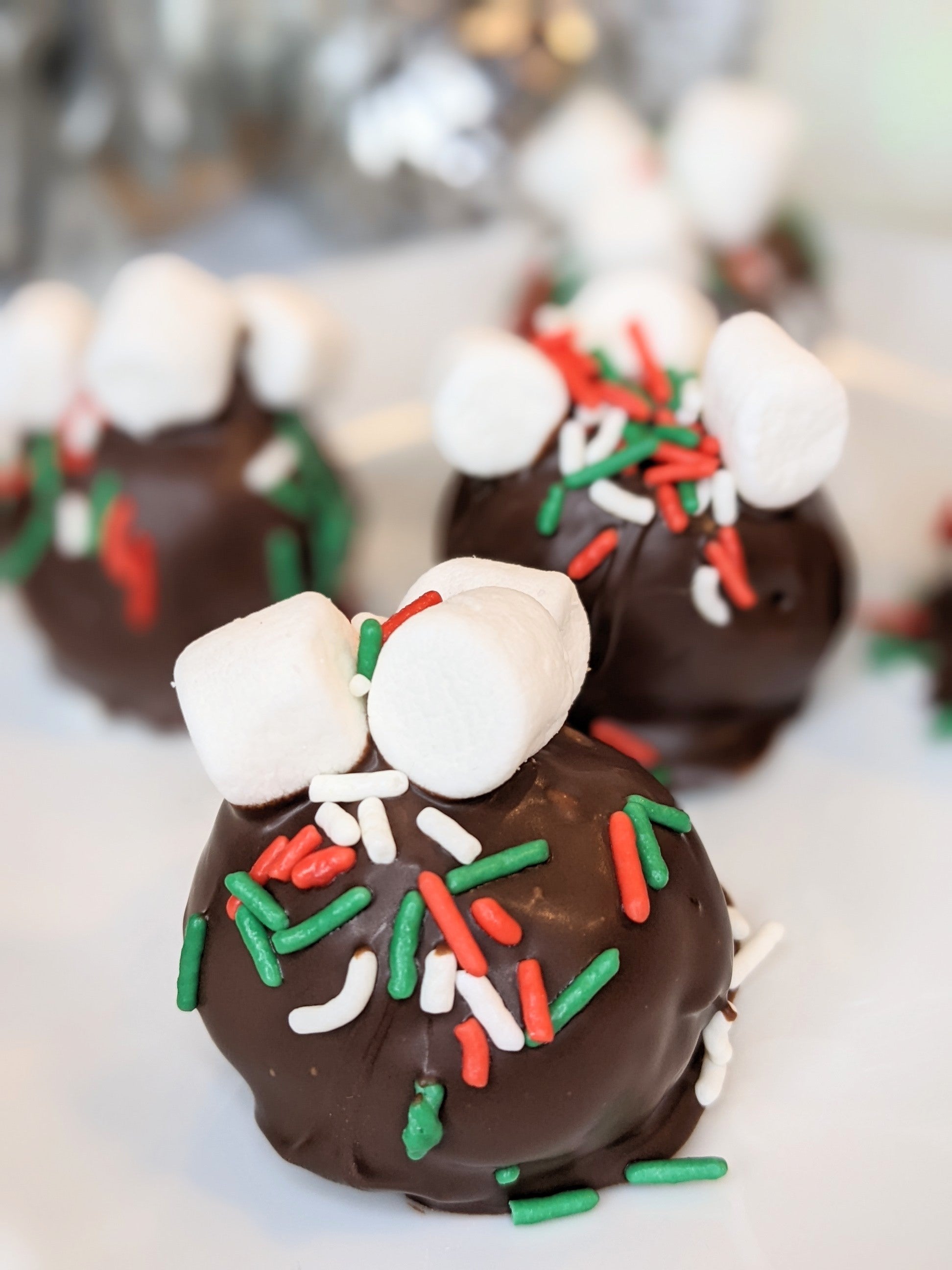 Our Hot Cocoa treats feature a super rich chocolatey cake infused with a chocolate truffle-flavored coffee roast. Combined with a marshmallow buttercream frosting then finished with a chocolate candy coating, mini marshmallows and festive sprinkles, these treats are a perfect holiday dessert! A dozen sweet treats in your choice of cake balls or cake pops (basically cake balls on a stick!).